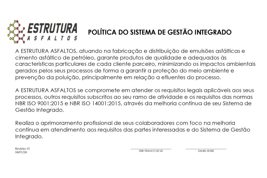 Nós somos a ESTRUTURA ASFALTOS, empresa que surge no mercado como uma opção na distribuição e fabricação de emulsões asfálticas, cimento asfáltico de petróleo e asfaltos diluídos. A empresa surge do sonho de um grupo de empresários que viu a oportunidade de pluralização do mercado.